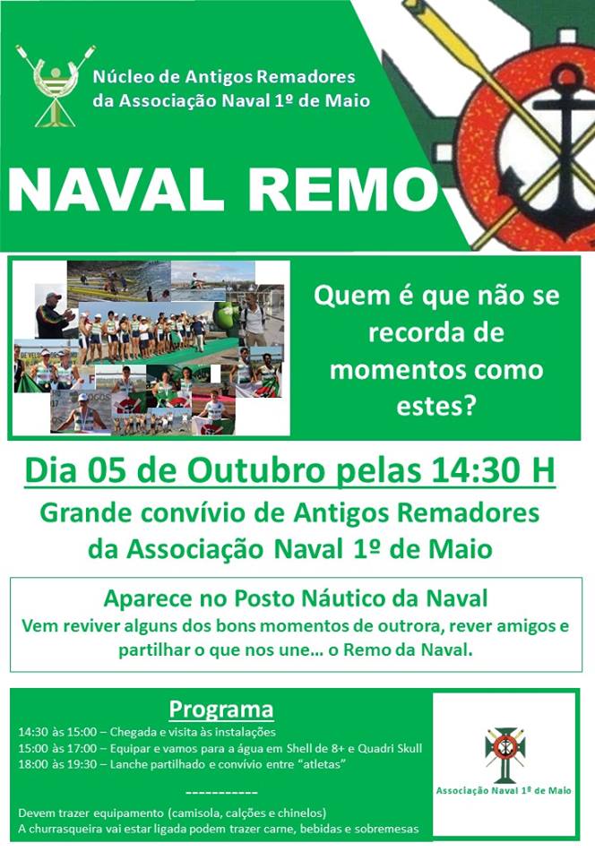 O Núcleo de Antigos Remadores da Associação Naval 1º de Maio convida todos os antigos remadores, simpatizantes, familiares e amigos do Remo da Naval para a realização de um convívio no próximo dia 05 de outubro pelas 14:30 Horas no Posto Náutico.
